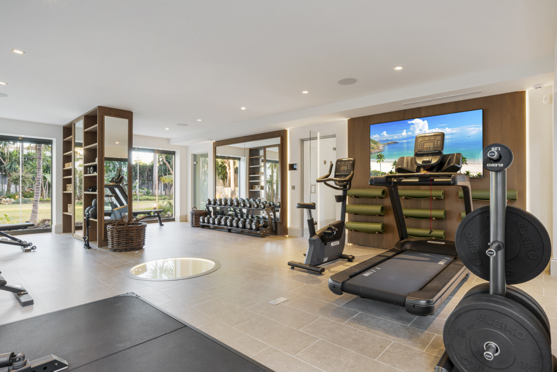 Additional lifestyle features are fully integrated into the property, including a fully fitted professional gym and a private spa area complete with a steam room and jacuzzi. A dedicated home office further enhances practicality, making the villa ideal for modern living.