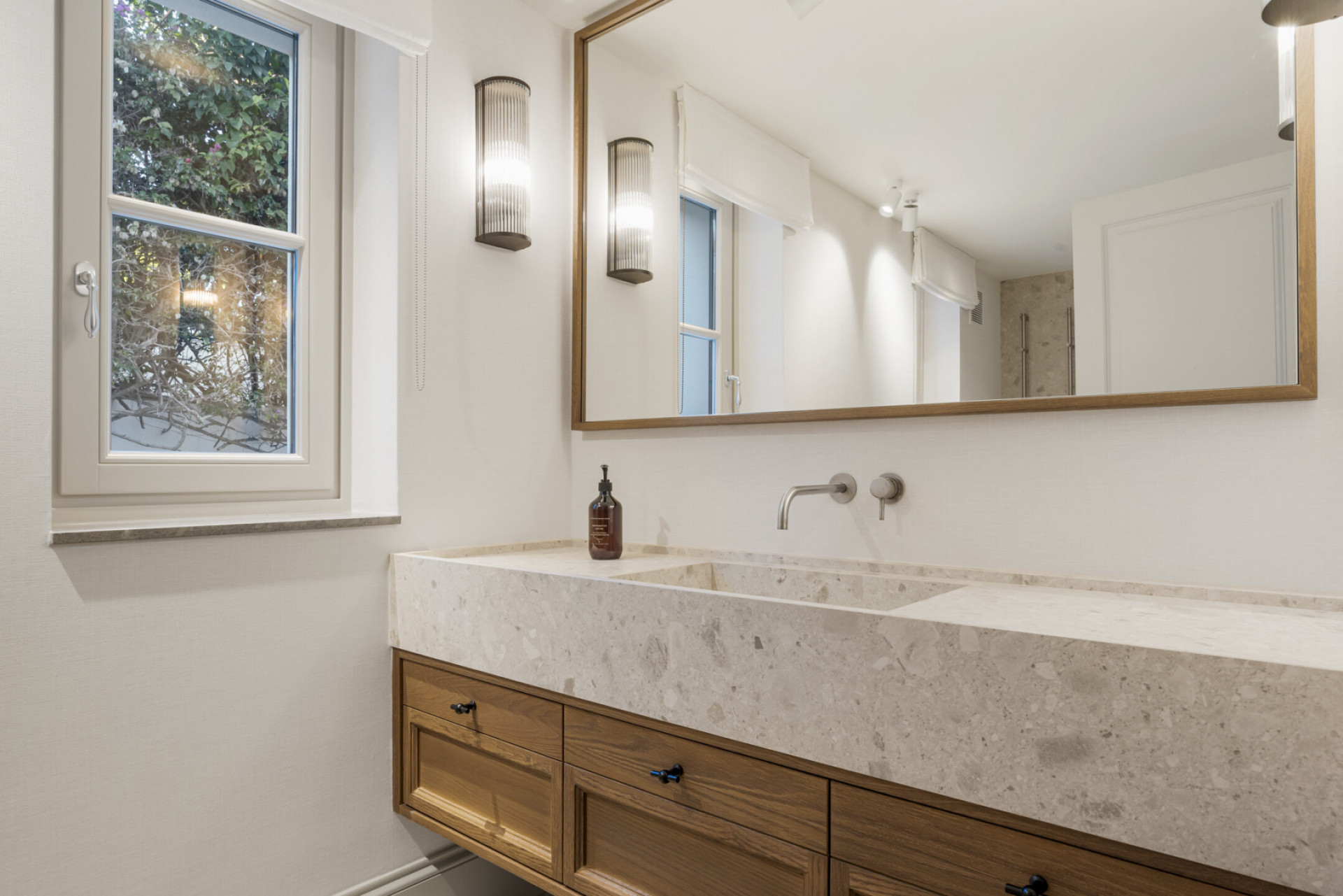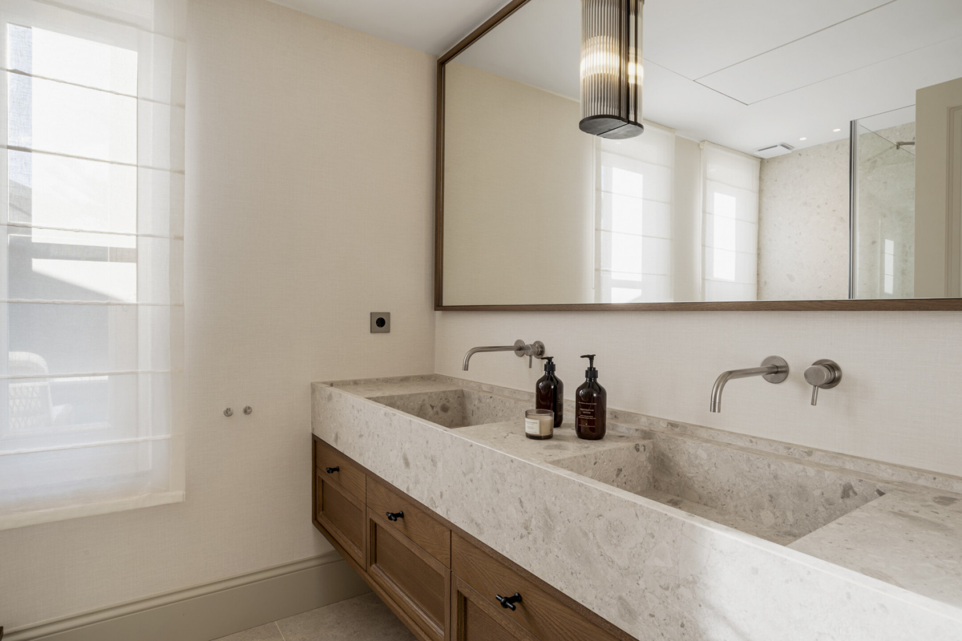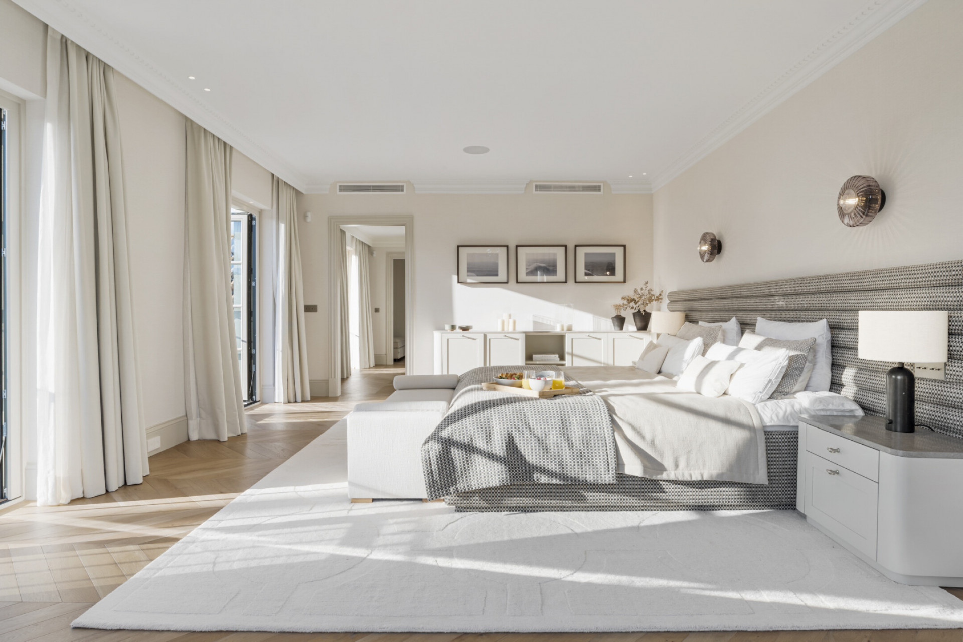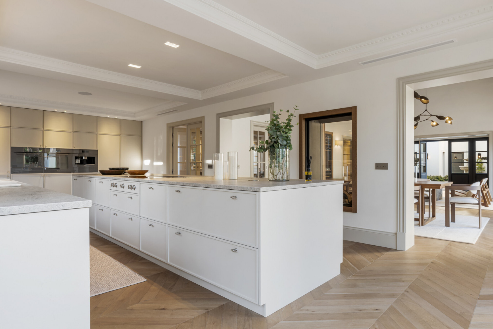 Inside, the home is designed with clarity and functionality in mind. The custom-designed kitchen combines usability with refined aesthetics, while the open-plan living and dining areas feature elevated ceilings, natural light, and direct access to the terraces. A soft, neutral palette with subtle timber detailing enhances the sense of warmth and cohesion throughout, complemented by underfloor heating across the entire home for year-round comfort.