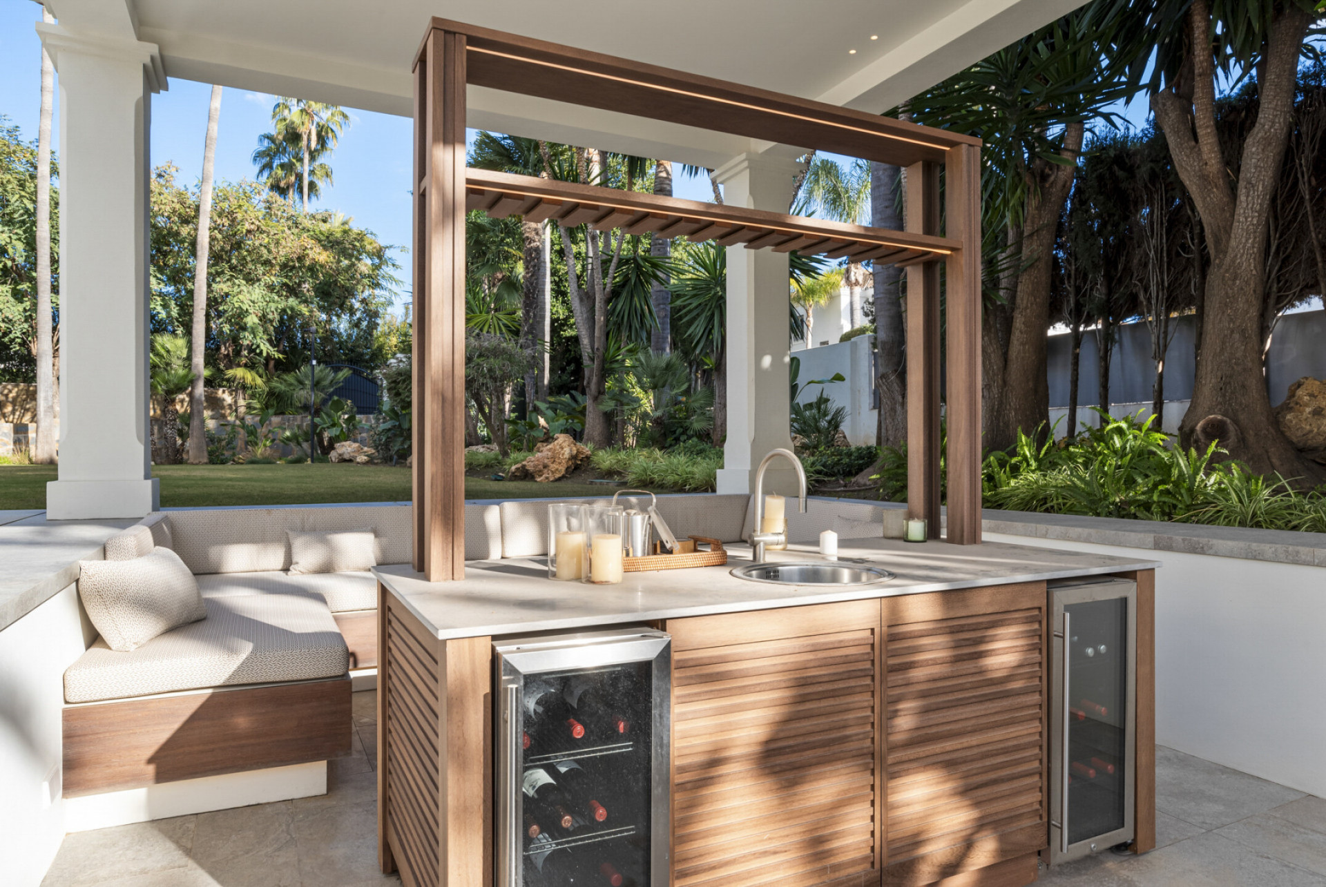 The outdoor area is a standout feature, centred around a unique sunken poolside lounge with a bespoke bar. This inviting space naturally transitions from daytime leisure to evening entertaining. An outdoor BBQ kitchen area further enhances the setting, creating the perfect space for al fresco dining and hosting.