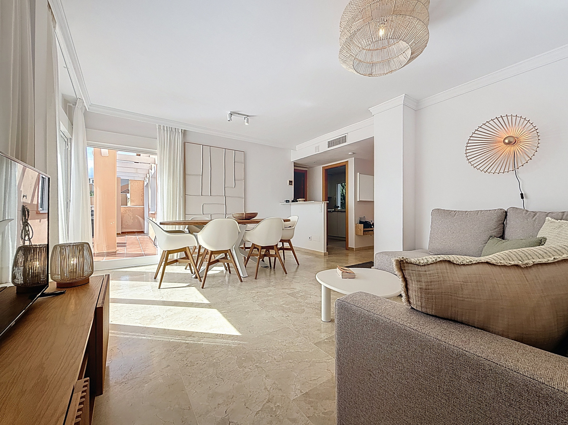 The fully renovated property stands out for its spacious layout and brightness. It features an entrance hall, a large living room opening onto a spacious south-facing terrace, which leads to a generous solarium, ideal for creating a true outdoor living space for relaxation, dining, and sunbathing.